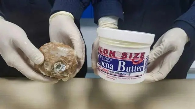深圳邮局海关关员在对转运货物开展监管时发现,1票申报为“椰子黄油”的包裹机检图像可疑,随即对其开箱查验。经查发现,该票包裹中有藏匿于罐装白色膏体内部的白色块状晶体1块,毛重217.1克。经专业机构鉴定,该白色晶体为4-甲基甲卡西酮,属于卡西酮类物质。目前,该案件已移交海关缉私部门处理。