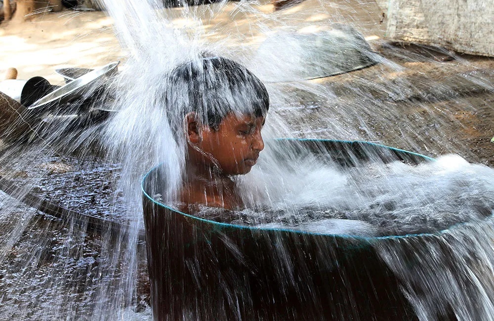 当地时间2024年5月31日,印度新德里,当地高温天气持续,男孩洗澡消暑。澎湃影像 图