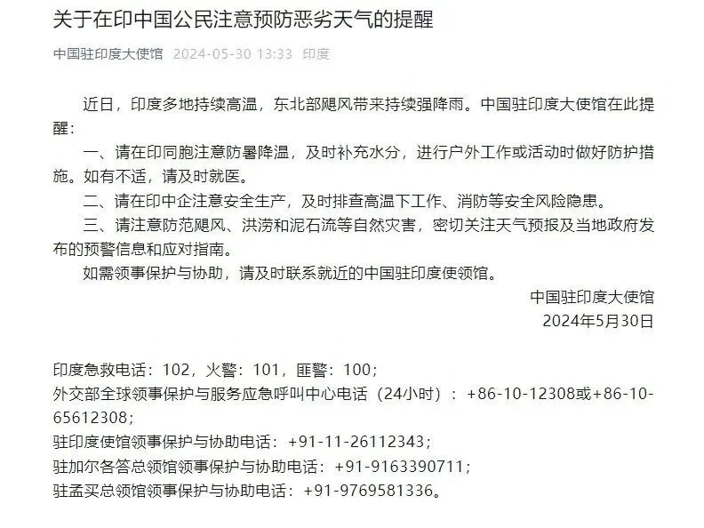 5月30日,中国驻印度大使馆提醒在印中国公民注意预防恶劣天气。