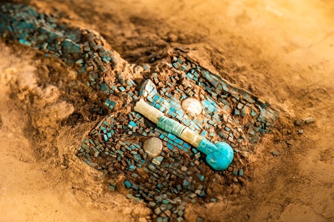 刘国祥介绍,绿松石龙形器在一座墓葬里被发现,长64.5厘米,由2000多片绿松石镶嵌而成。考古人员把它套箱整取带回了实验室清理,才能完整地把它呈现出来。