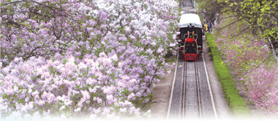 哈尔滨市儿童公园小火车在丁香花海中穿行。