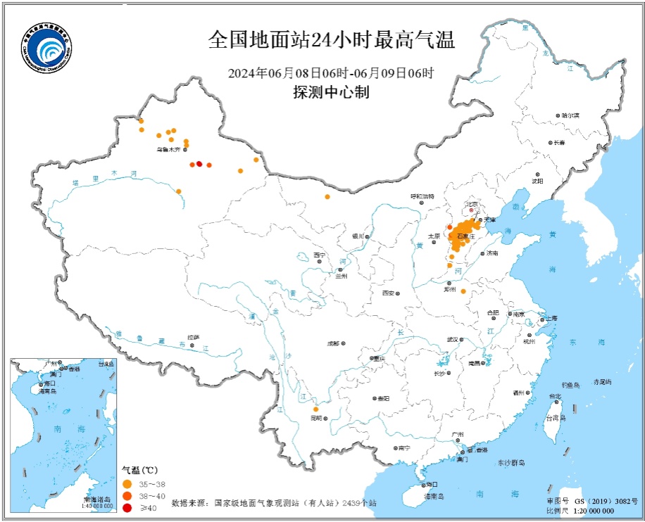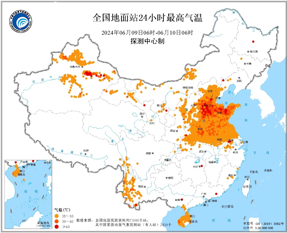 今天,本次高温过程的鼎盛时段到来,新疆、内蒙古、河北、北京、山西、山东、河南等地高温的势头依旧很猛,山东、新疆局地气温还超过了40℃,山东多地高温天气为同期少见,共有25站打破或追平6月上旬最高气温纪录。