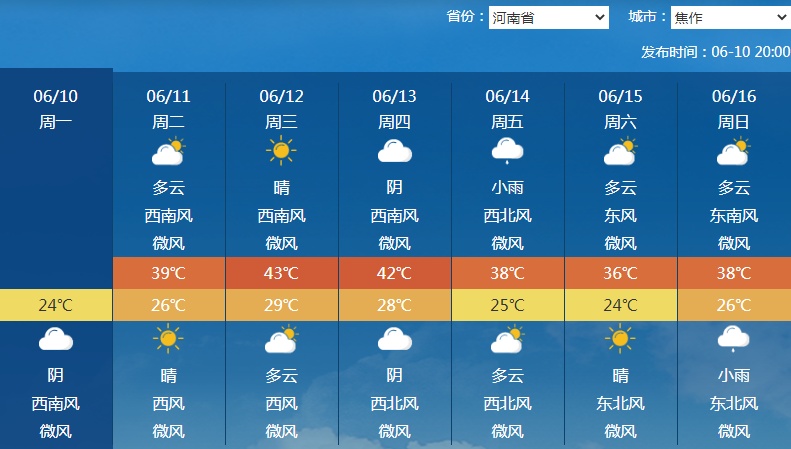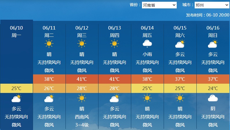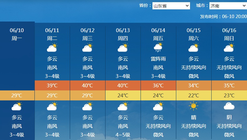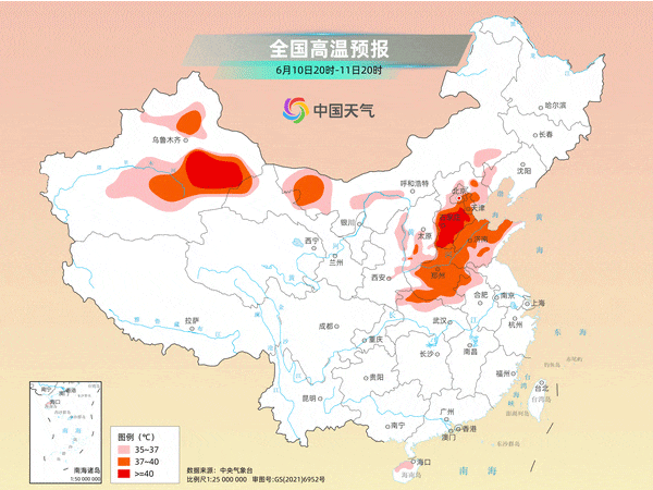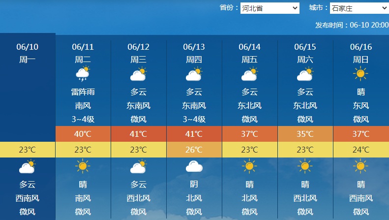 一些地方的高温,有一定极端性,河北、河南、山西、山东等地部分地区的日最高气温可达到或突破历史同期极值。像河南濮阳12日至13日最高42℃,可能打破当地6月最高气温纪录。此外,济南、郑州、石家庄、焦作、新乡等地也可能连续2~3天出现40℃以上的酷热天气。