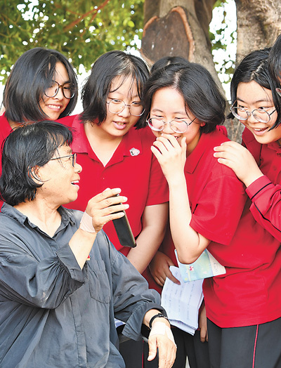 6月7日,晨读过后,华坪女高全校师生来到教学楼前为高三女孩们送考。张桂梅拿着小喇叭,跟女孩们一起唱起了歌。看着高三的考生上车,高一高二的女孩们一遍遍喊着“加油”,声音特别响亮。送高三的姐姐们奔向远方,那也是高一高二女孩们的梦想。