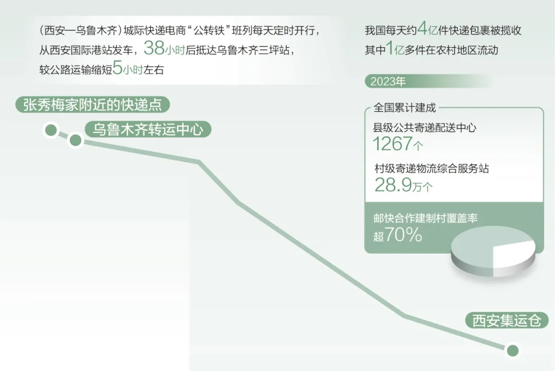 包裹经(西安—乌鲁木齐)城际快递电商“公转铁”班列至张秀梅家附近快递点的路线示意图。蔡华伟制图 数据来源:国家邮政局
