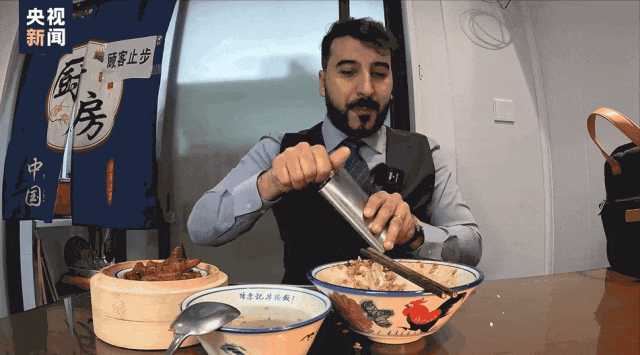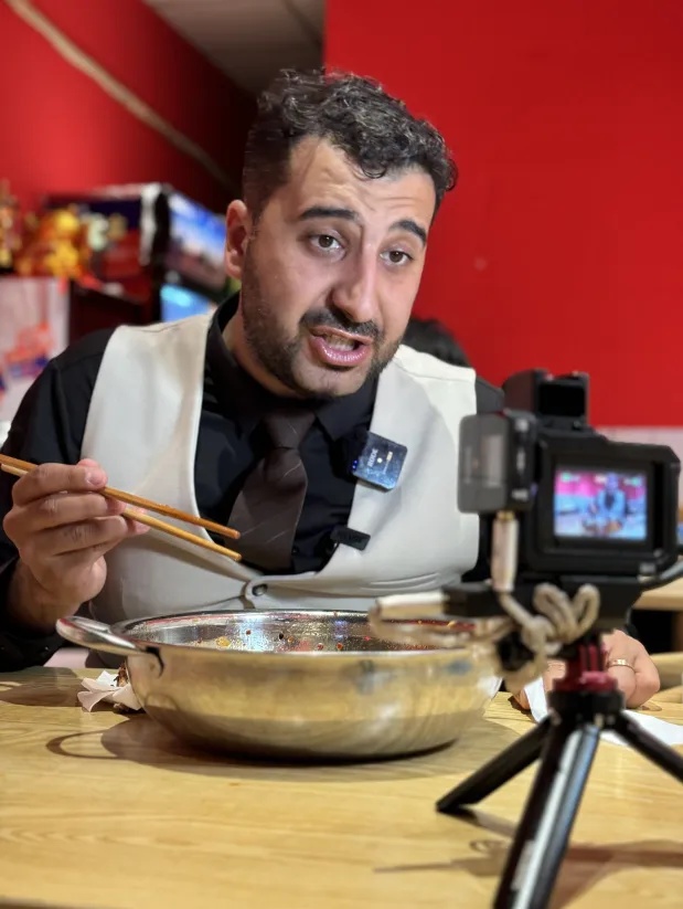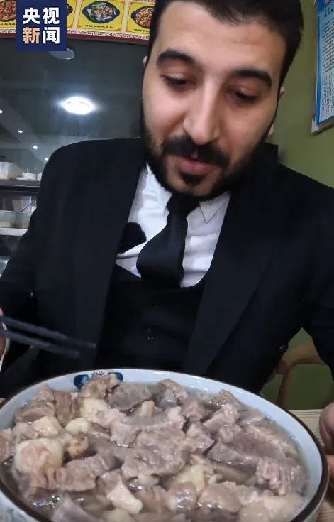一身立整的西服、一头卷发和络腮胡、一口略带口音的汉语,他叫艾哈迈德·穆罕默德·贾巴(中文名:王立轩),来自伊拉克,是一名美食博主。