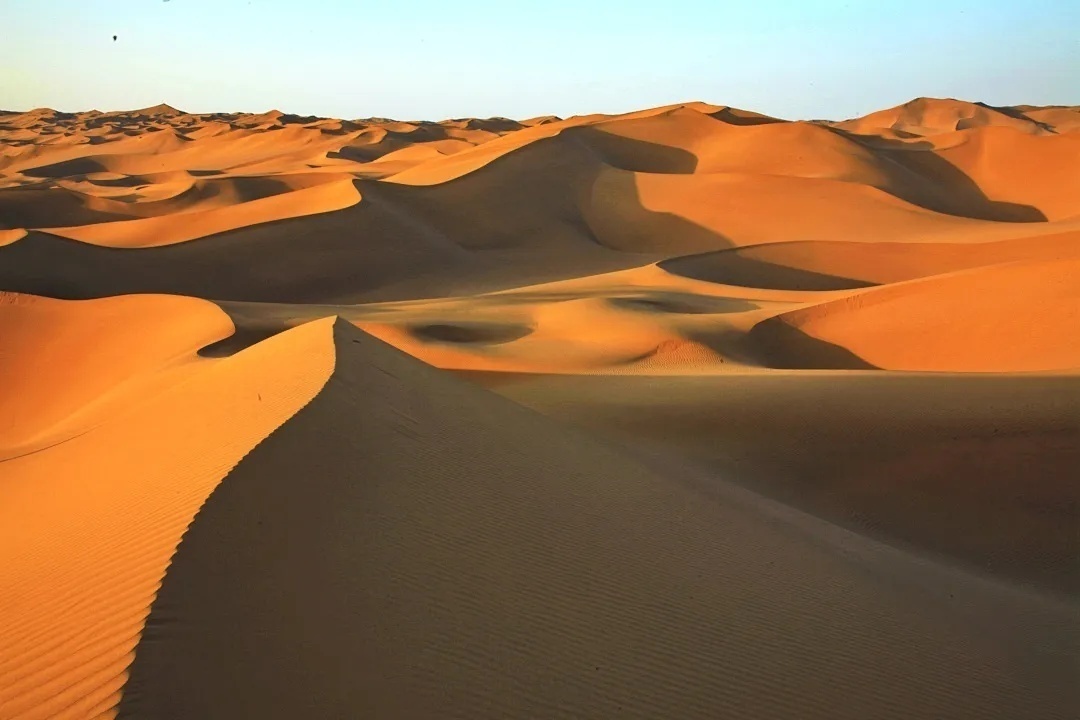 这里的沙丘类型多样,呈蜂窝状、羽毛状、鱼鳞状等,且变幻莫测。
