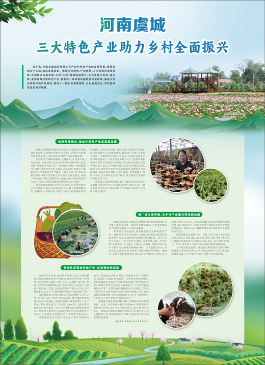近年来,河南省虞城县根据主导产业和特色产业的发展需要,统筹谋划生产布局,制定发展规划。依托区位优势、产业优势、人才优势和资源优势,在稳住农业基本盘、守好“三农”基础的前提下,大力发展中药材、速生菜、食用菌等优势特色产业,探索出一条巩固拓展脱贫攻坚成果、推进乡村全面振兴的有效路径,描绘了一幅农业高质高效、乡村宜居宜业、农民富裕富足的美好图景。