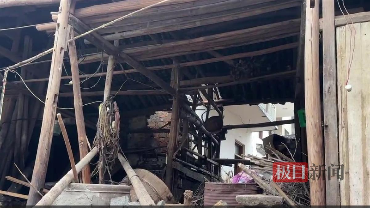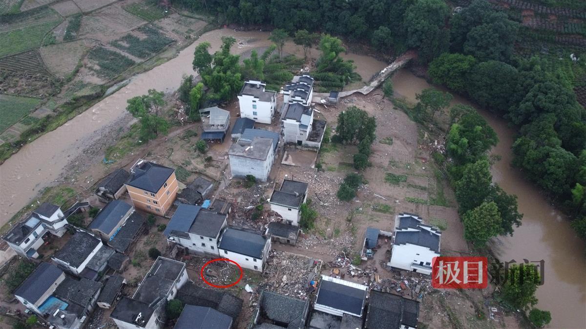 21日下午,极目新闻记者在歙县王村镇八村文川自然村项先生家附近看到,他家的猪栏位于屋后20米处,在洪水的冲击下已经垮塌。水位退去之后,可见附近房屋墙壁上约2米高的水线,附近基础房屋均出现大面积的垮塌。