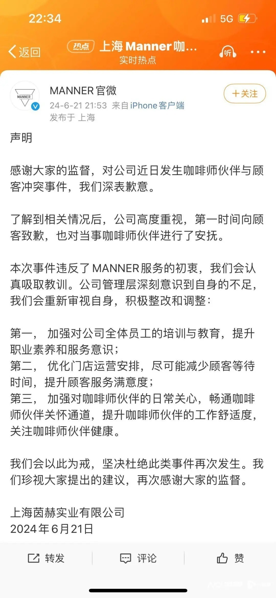 昨晚(6月21日),知名连锁咖啡品牌Manner发表致歉声明。声明称,“对公司近日发生的冲突事件,我们深表歉意。本次事件违反了Manner服务的初衷,我们会认真吸取教训。公司管理层深刻意识到自身的不足,我们会重新审视自身,积极整改和调整。”