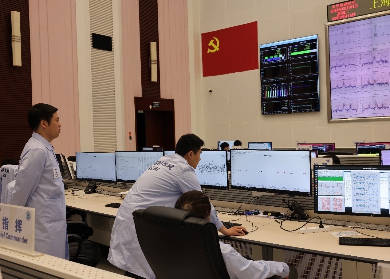 6月4日,嫦娥六号上升器在月面起飞后,科研人员在上海佘山VLBI观测网指挥中心查看数据。中国科学院上海天文台供图