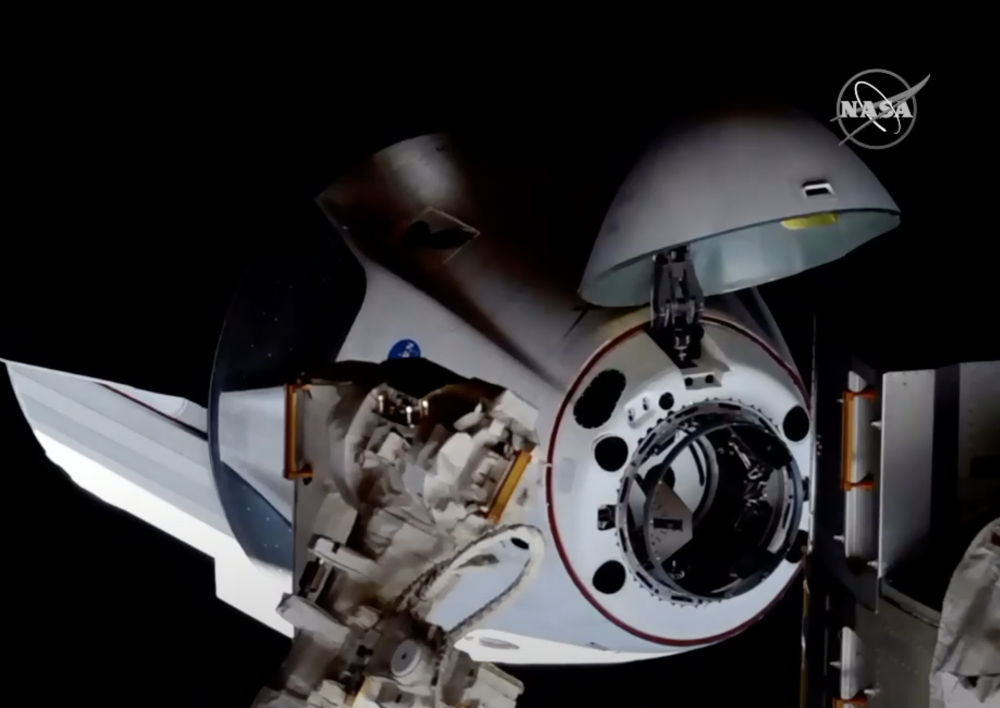这张由美国航天局2020年5月31日发布的视频截图显示美国太空探索技术公司“龙”飞船正在与国际空间站对接。新华社发(美国航天局供图)