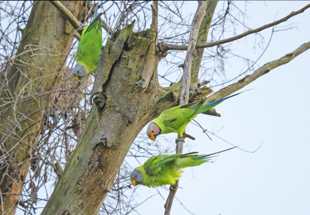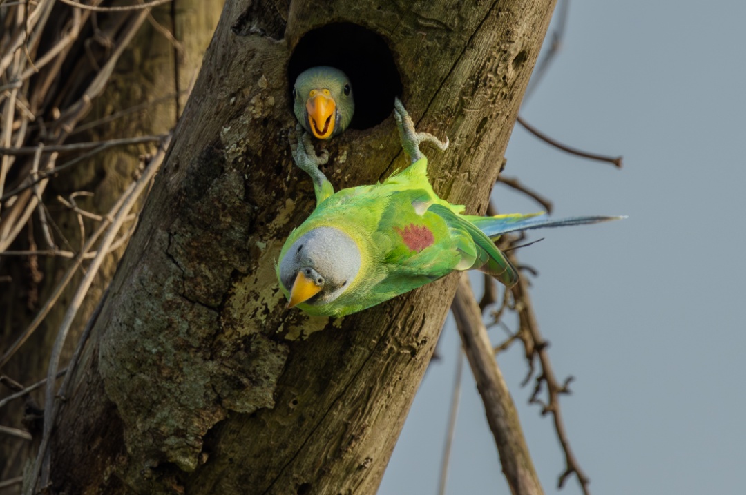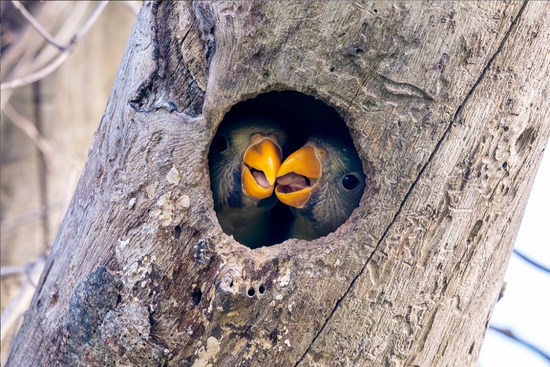 “2023年,我在瑞丽市拍摄到超过100只花头鹦鹉,2024年又拍摄到这巢花头鹦鹉成功繁殖了2只幼雏。”中国野生动物保护协会志愿者呼晓宏说:“这些花头鹦鹉都分布在村庄周围,说明它们和人的关系还是比较亲近的。只要人们能够保护好、守护好鸟儿,那么它们就能在德宏更好地繁殖。”