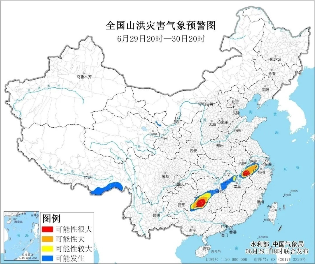 预计6月29日20时至6月30日20时,浙江西北部、安徽南部、江西东北部、湖南西部、广西北部、贵州东南部等地部分地区发生山洪灾害可能性大(橙色预警)。