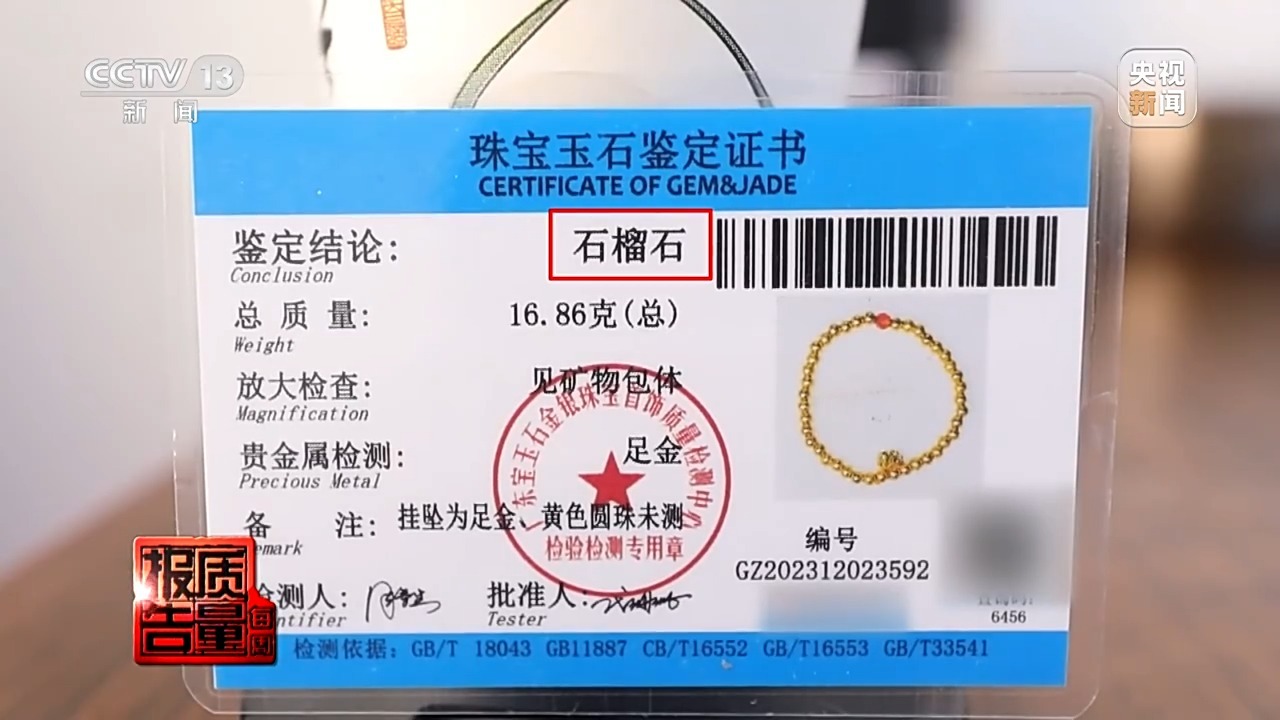 再看直播间商家提供的鉴定证书,检测主体为“石榴石”,贵金属检测为“足金”,备注位置写着“挂坠为足金,黄色圆珠未检测”。也就是说,商家寄来的这张证书是以手串上的石榴石为检测主体。