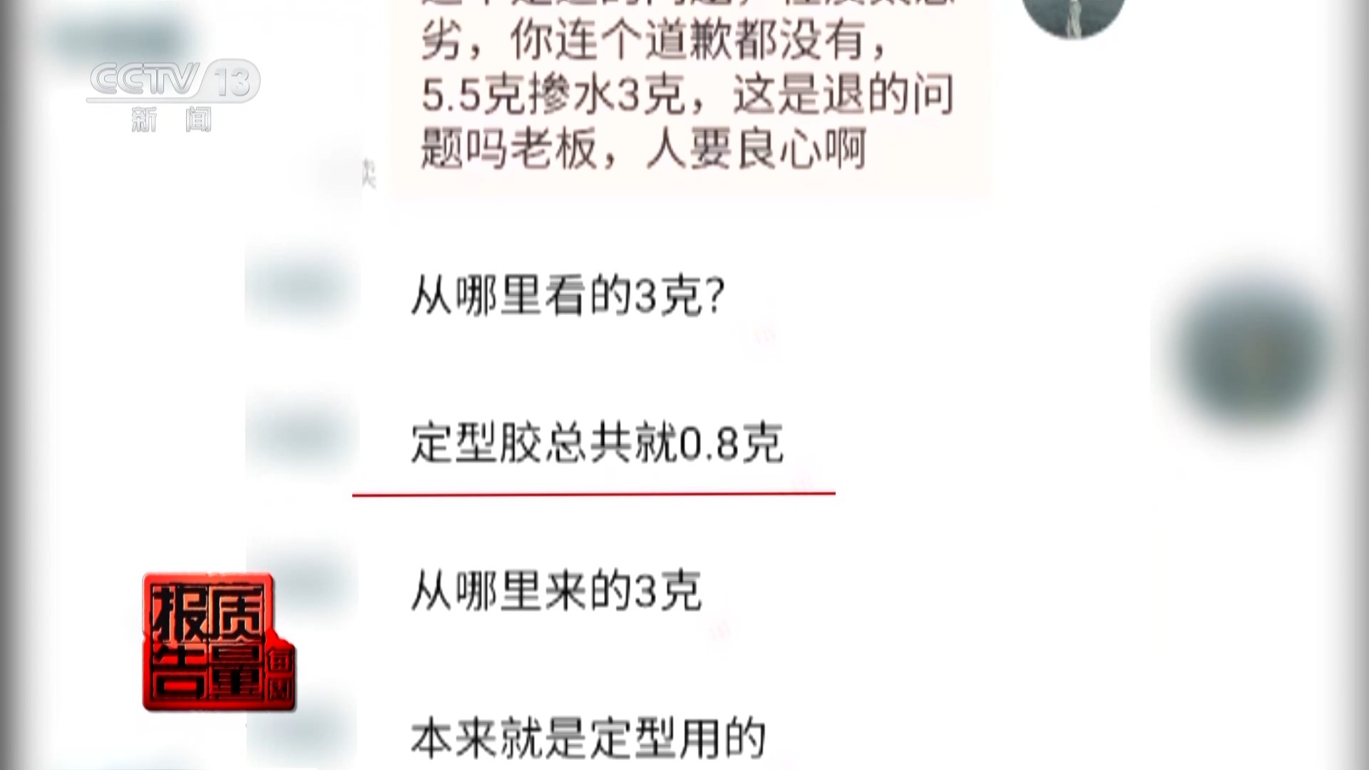 记者在韩先生与商家的聊天记录中看到,韩先生质疑商家,5.5克的吊坠中间怎么还能夹杂别的物体,商家竟表示,中间的是定型胶总共就0.8克,是用来定型的。合着0.8克的定型胶也让商家售出了黄金的价,韩先生决定走司法途径保护自己的合法权益。