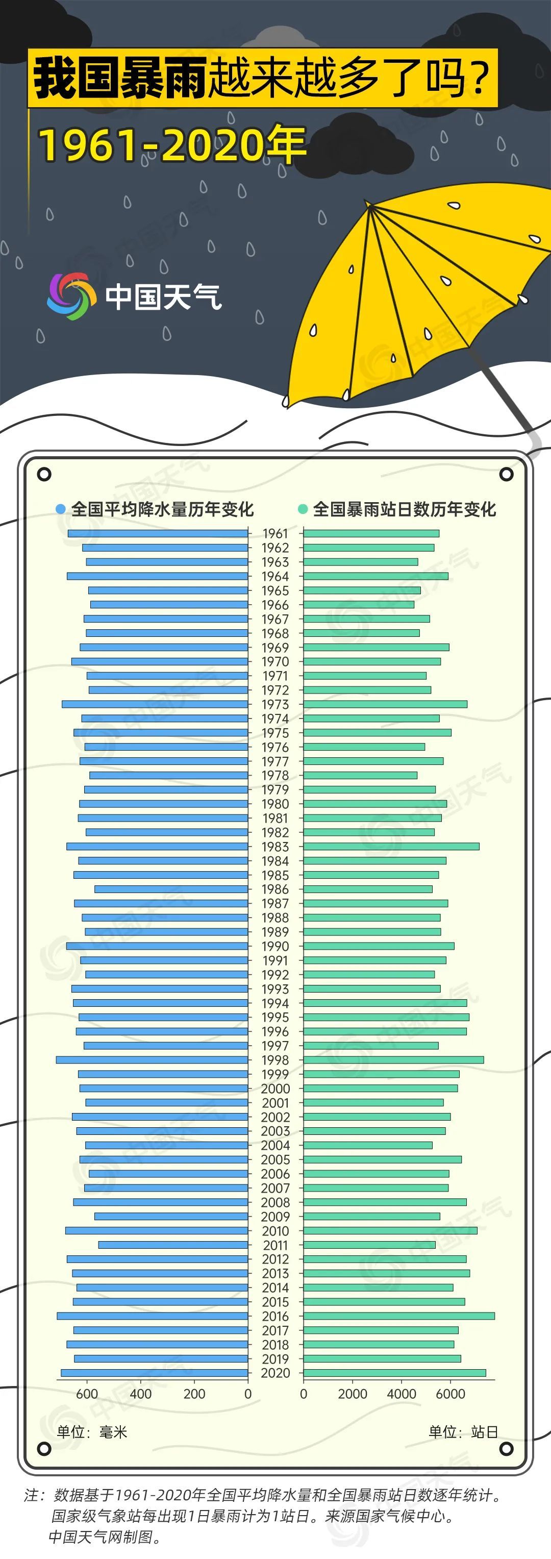 “桂林暴雨变威尼斯”、“长沙暴雨1小时下了54个西湖”、“杭州灵隐寺发大水”……今年6月进入主汛期以来,南方地区的暴雨过程一轮接一轮,多地降水量突破历史同期极值,暴雨相关话题频登热搜。今年南方强降雨有多猛?暴雨如此频繁是否罕见?影响我国的暴雨是否越来越多?中国天气网盘点气象大数据,揭秘我国暴雨60年之变。