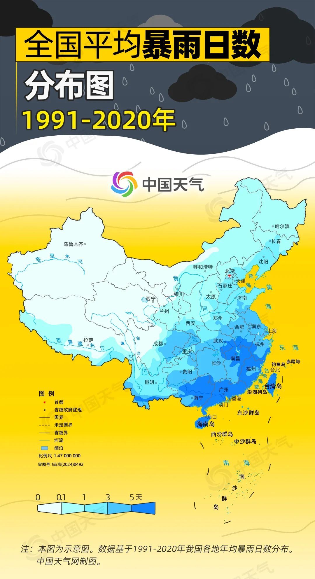 从常年来看,江南、华南等地是我国强降雨多发地。中国天气网统计常年暴雨日数分布情况发现,我国暴雨最多发区域集中在广东、广西、福建、江西、海南、台湾以及湖北东南部、云南南部等地,年均暴雨日数在5天以上,江苏、浙江、安徽、湖南、重庆以及贵州中南部、湖北东部和南部、四川东部等地年均暴雨日数在3至5天,为次多地区。