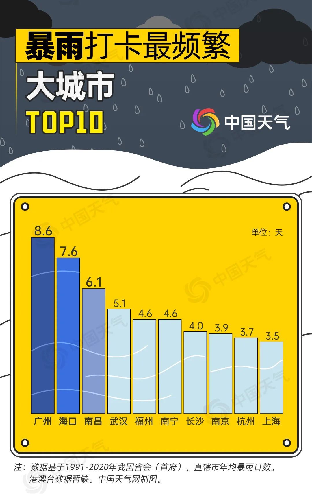 从暴雨打卡最频繁的大城市来看,广州的年均暴雨日数最多,高达8.6天,海口、南昌分别以7.6天和6.1天位列二三名,武汉、福州、南宁、长沙、南京、杭州、上海也上榜,年均暴雨日数超过3天。