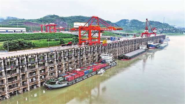7月4日,忠县,重庆新生港国内集装箱班轮首航,来自湖北枝江的12个标准集装箱(化肥)顺利抵达新生港并实施卸货。