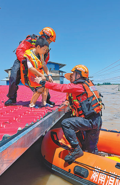 7月6日,湖南省湘潭市消防救援支队舟艇编队再次进入华容县团东村进行搜救工作,成功转移被困群众。许 琦摄(人民视觉)