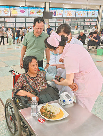 7月6日,在湖南省岳阳市华容县职业中专安置点,医护人员为转移群众测量血压。喻熙荣摄(人民视觉)