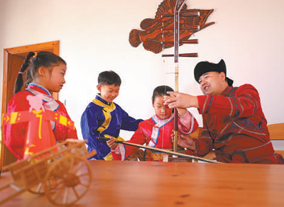 哈拉新村村民在教当地孩子演奏传统乐器。