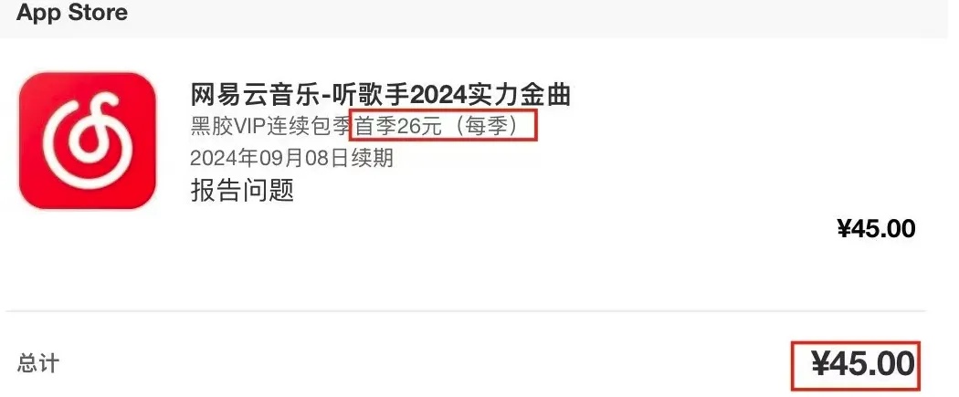 “6月8日,网易云音乐APP系统弹出页面提示我会员过期,并大字显示有包年和包季等多个续费套餐,当时我觉得黑胶VIP季卡26元的优惠价格还能接受,就点击付费,结果付完款后发现被扣了45元。”