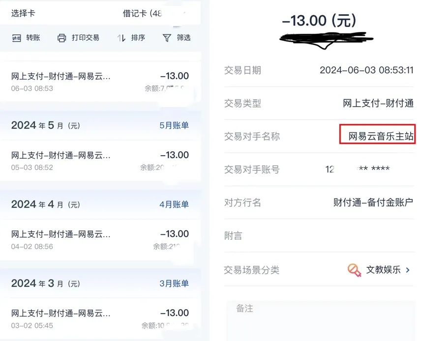 广州的消费者宋先生向记者反映,他于2022年5月开通过一次网易云音乐的会员,用了几天后就卸载了APP,两年多来由于未收到短信等通知提醒,他并不知道该会员会自动续费。今年6月3日,宋先生无意间翻账单时发现有一笔“网易云音乐主站”的13元扣款,追溯记录发现从2022年5月开始已连续扣款26个月,共计338元。