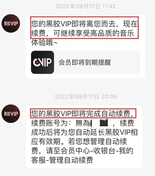 “您的黑胶VIP即将离您而去,现在续费,可继续享受高品质的音乐体验。”当天晚上又有消息显示:“您的黑胶VIP即将完成自动续费,续费成功后将为您自动延长黑胶VIP相应有效期。”