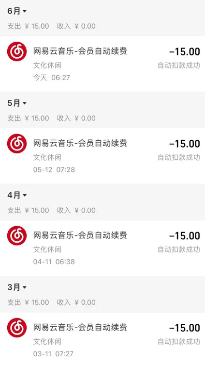 无独有偶,安徽铜陵消费者陈女士告诉记者:“今年6月份无意间翻看支付宝账单时发现从3月份开始,网易云音乐连续4个月自动扣除会员费共计60元。”陈女士说:“今年2月11日曾花费9.8元购买过一个月的网易云音乐会员,由于3月份登录账号对应的手机号在移动公司注销,期间并未收到过任何扣款提示,也没用该账号登录网易云音乐使用会员权益,所以并不知道该会员还会自动续费。”