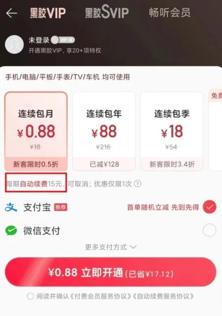 7月3日,记者打开网易云音乐APP进入开通会员页面,发现一共有黑胶VIP、黑胶SVIP和畅听会员三种类型,页面大字显示“连续包月0.88元”“连续包季18元”等,小字显示“新客限时0.5折,每期自动续费15元”“新客限时3.4折,每期自动续费45元”“优惠仅限一次”“可取消”等。