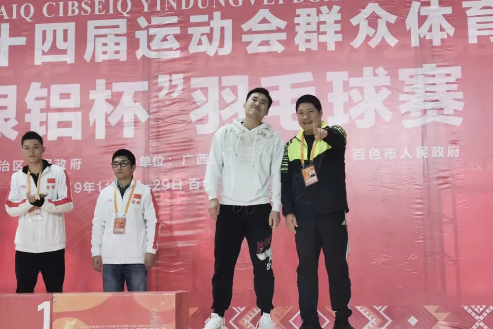熊俊豪(右二)在广西壮族自治区第十四届运动会群众体育项目羽毛球比赛中夺得名次,赛后与教练(右一)在领奖台上合影(受访者供图)。