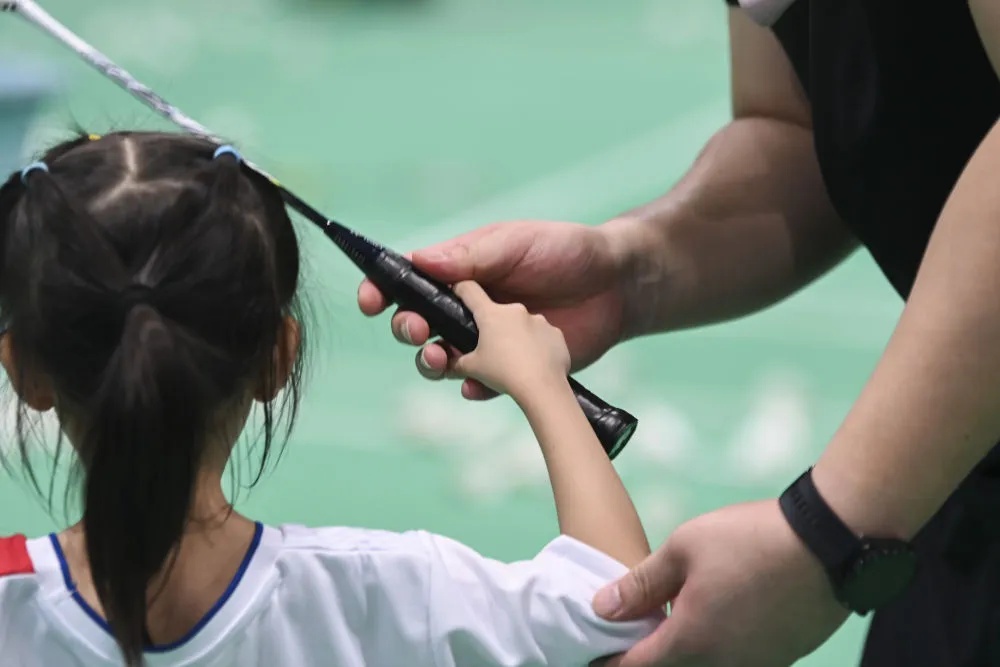 熊俊豪(右)手把手教黄馨媛握拍动作。
