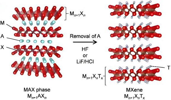 图1.MAX相(Mn+1AXn)转换为MXene相(Mn+1XnTx)示意图