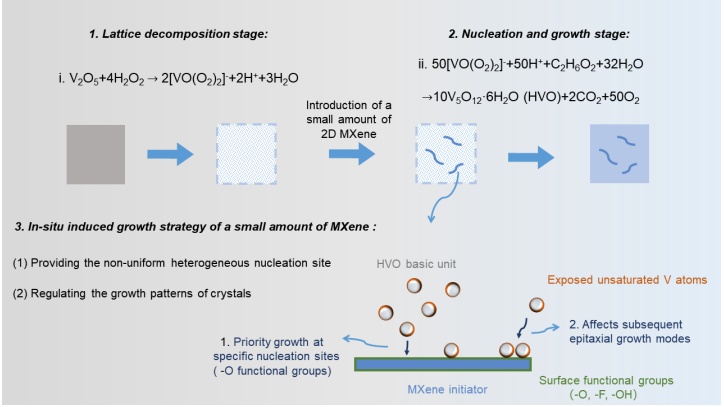 鉴于此,兰州大学材料与能源学院彭尚龙教授团队受到聚合物电解质工程的启发,提出了一种基于MXene材料的原位诱导生长策略。该策略通过在电极材料的成核和生长过程中引入少量的MXene,作为异质成核点和引发剂,调控阴极材料的晶体生长模式,实现了电化学性能的提升。而且,此方法具有一定的普遍意义,可推广到其它材料体系中。作为概念化的验证,以钒氧化物阴极为例,成功地调控了钒氧化物的形貌,并引入了缺陷。研究结果显示不仅在合成阶段直接引入了氧缺陷,而且避免了特定反应环境或容器的需求,实现了高安全性和高产量。通过这种方法得到的诱导钒氧化物表现出高的比容量和良好的倍率性能。此外,这项工作通过对Ti3C2MXene调控钒氧化物晶体生长模式相关机理的讨论,还揭示了MXene在晶体生长过程中的化学诱导机制与策略可行性,这将有助于深入理解、开发和推广MXene材料的原位诱导生长方法在二次电池领域的应用。
