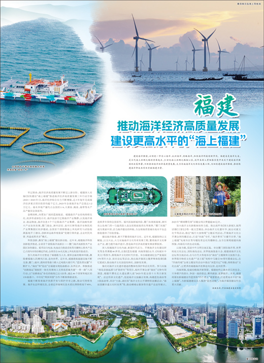 科技创新,激发“海上福建”建设新动能。近年来,福建海洋科技创新稳步推进,全省首个省级海洋高新区——厦门海洋高新技术产业园区加快建设。船用动力电池、电池动力推进系统等关键核心技术产品已占国内市场份额近四成,全球首台16兆瓦海上风电机组吊装成功。