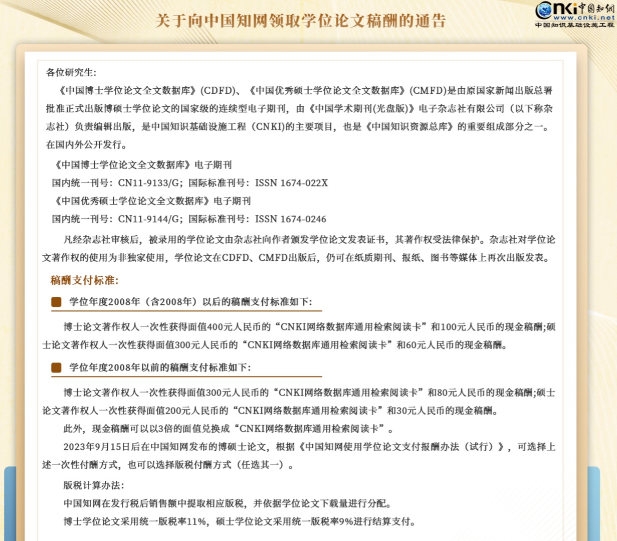 在知网去年12月份发布的《关于向中国知网领取学位论文稿酬的通告》中,明确2023年9月15日后在知网发布的硕士、博士学位论文,作者可以在稿酬领取模式上选择“一次性稿酬模式”或“版税制稿酬模式”。