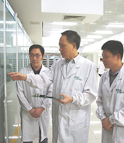 汤广福(中)指导团队开展柔性直流输电技术研发。 |
