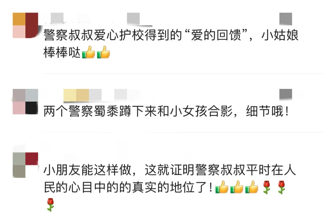 警察叔叔还暖心地蹲下跟小女孩合了影