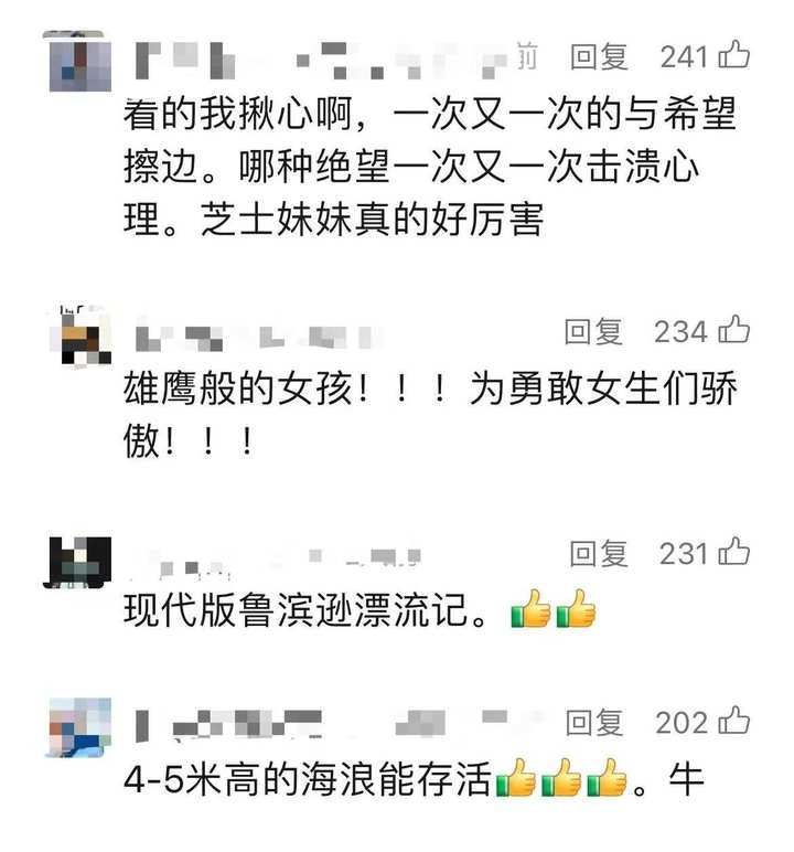面对生死考验,芝士曾不停在救生圈上尝试各种姿势,试图保存体力。不会游泳的她,还学会了把两条腿放松,然后趴着让腿浮在身体后面,这时,腿指向的方向,就是她会被浪缓缓带去的方向。依靠这个办法,她试图靠近所能遇到的船只,哪怕没有被注意到,也没有放弃希望。