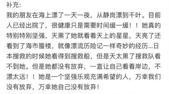 从芝士的自述来看,在海上漂流的36个小时里,她没有进食,也坚持没喝海水,只用海水润湿嘴唇。