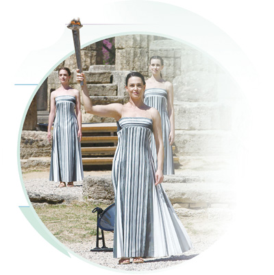 当地时间4月16日,巴黎奥运会火种在奥林匹克运动发祥地——希腊古奥林匹亚遗址采集成功。仪式结束后,象征着光明、团结、友谊、和平、正义的奥运圣火正式开始传递之旅。图为火种采集仪式上,由希腊女演员玛丽·米娜(前)扮演的古希腊女祭司在展示火炬。 |