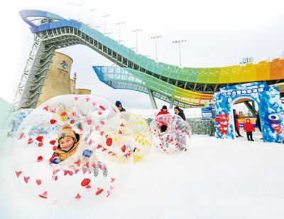 坐落于北京首钢老工业园区的首钢滑雪大跳台是2022年北京冬奥会单板滑雪大跳台及自由式滑雪大跳台项目的比赛场地,也是世界首例永久保留和使用的大跳台场地。冬奥会后,大跳台开展四季全民健身活动,打造专业比赛训练场地,持续推动冬奥场馆的可持续利用。图为2023年12月,小朋友们在“首钢园冰雪汇”活动中体验雪上游乐项目。 |