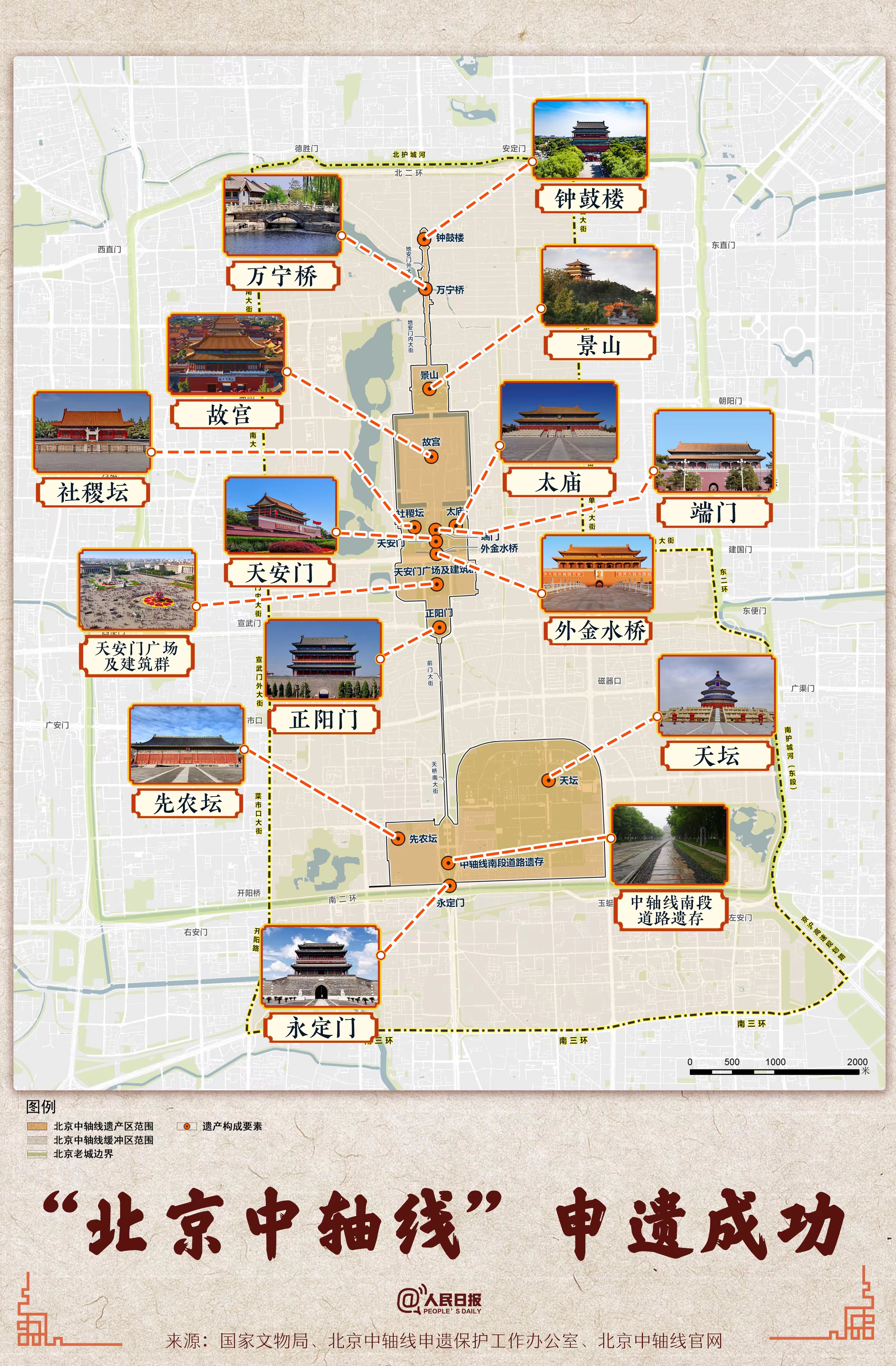 “北京中轴线”纵贯北京老城南北,始建于13世纪,形成于16世纪,此后经不断演进发展,形成今天全长7.8公里、世界上最长的城市轴线。“北京中轴线”由古代皇家宫苑建筑、古代皇家祭祀建筑、古代城市管理设施、国家礼仪和公共建筑以及居中道路遗存等五大类遗存共同组成,其选址、格局、城市形态和设计体现了《周礼·考工记》所记载的理想都城范式,展现了中国古代王朝制度和城市规划传统,见证了北京城市的发展演变。“北京中轴线”15个遗产构成要素,自北向南依次为:钟鼓楼、万宁桥、景山、故宫、端门、天安门、外金水桥、太庙、社稷坛、天安门广场及建筑群(天安门广场、人民英雄纪念碑、毛主席纪念堂、国家博物馆和人民大会堂)、正阳门、南段道路遗存、天坛、先农坛、永定门,遗产区面积589公顷,缓冲区面积4542公顷。