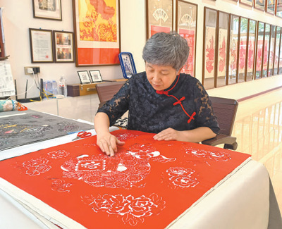 海伦剪纸源自黑龙江海伦市,主要采用灯烟熏和剪刀剪的手法进行制作。历经百年传承与发展,海伦剪纸逐渐形成了独具特色的满族剪艺风格,其剪纸画幅较大,通常以花鸟鱼虫、飞禽走兽等为创作题材,造型简洁而质朴。 海伦市“傅作仁满族剪纸世家”第四代传承人傅清超正在制作海伦剪纸《百花送福》。 韩国籍设计师 吴世勋摄 |