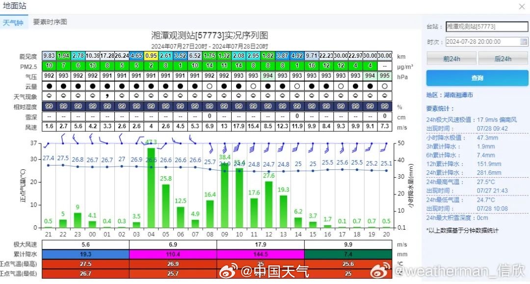 中国天气气象分析师于群表示,湖南最强降雨时段集中在27日20时至28日20时,湖南长沙、湘潭、双峰、衡东均出现特大暴雨,降雨强度历史罕见。其中,湖南湘潭出现了破纪录的特大暴雨,降雨量281.6毫米,也是当地观测史首次出现特大暴雨。