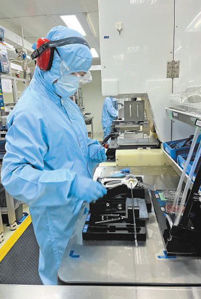 穿上连体洁净服、套上洁净鞋套、戴上一次性口罩和一次性网帽,记者经过多次消毒,走进一个生产车间。这个车间有6条生产线正在量产,每条生产线上有六七名工人。王艳说:“随着美敦力中国本土化研发能力的提升,上海工厂将承担更多高科技医疗器械产品的本土化生产。”