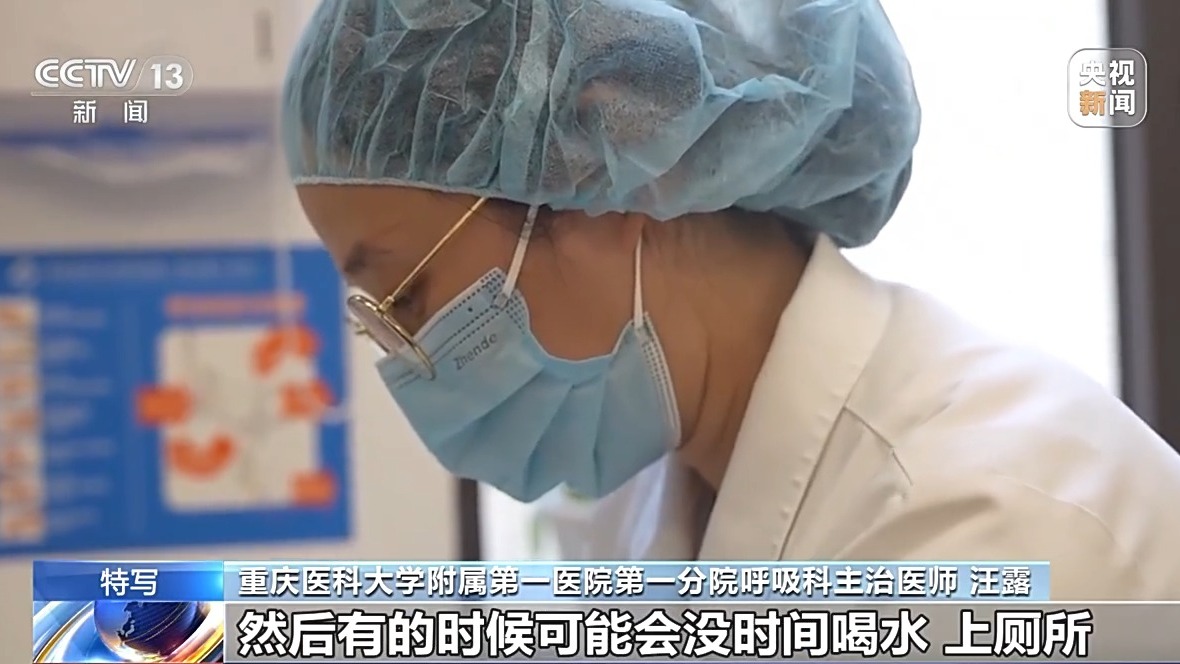 重庆医科大学附属第一医院第一分院呼吸科主治医师 汪露:二十多个患者的时候,可能就没有休息的时间。从早到中午,到下午上班,一直是做着检查,有的时候可能会没时间喝水、上厕所。