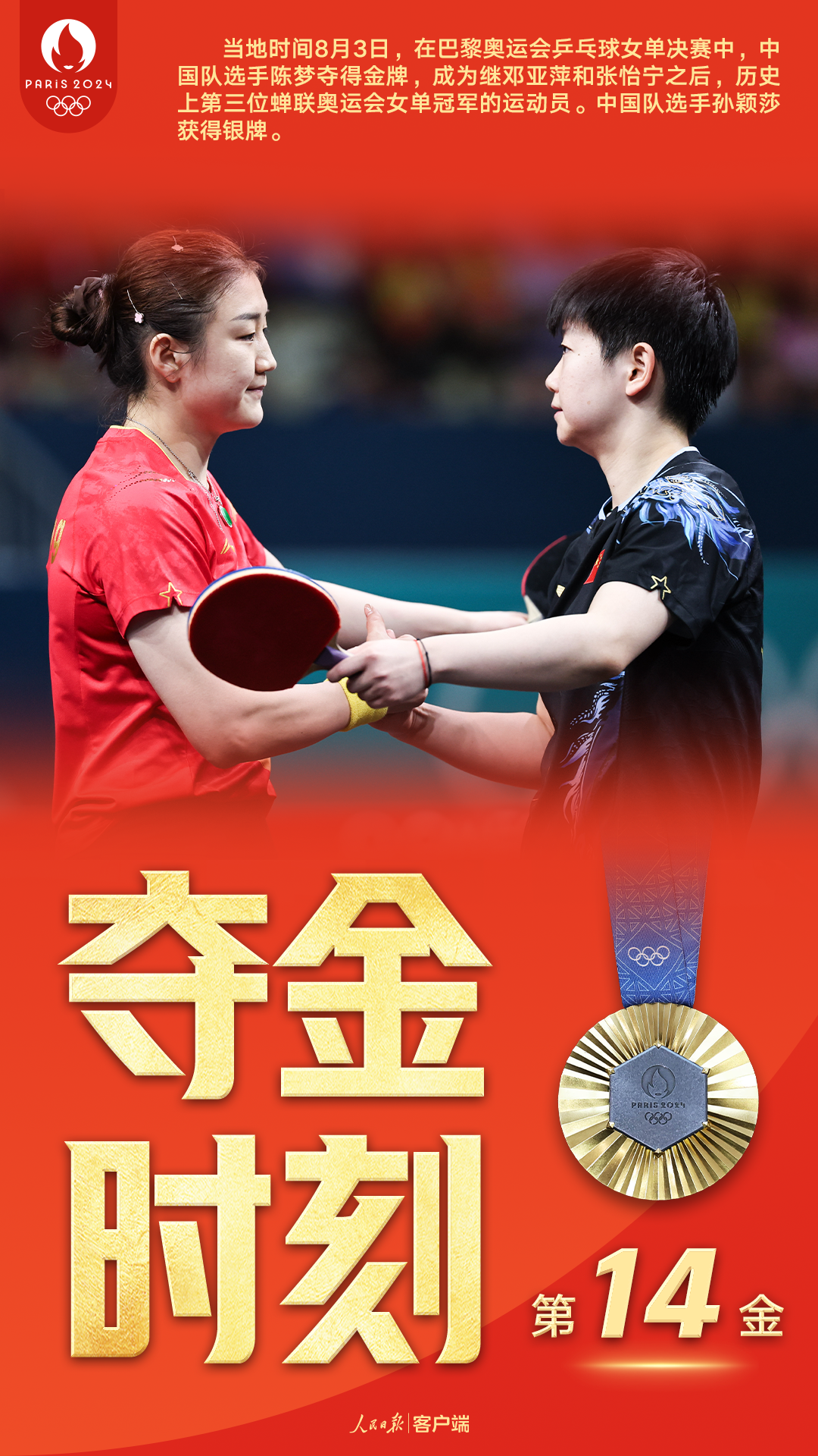 当地时间8月3日,巴黎奥运会乒乓球女单决赛在南巴黎竞技场4号馆举行。刚刚,中国队选手陈梦战胜队友孙颖莎,成功卫冕女单冠军,成为继邓亚萍和张怡宁之后,历史上第三位蝉联奥运会女单冠军的运动员。孙颖莎获得银牌。